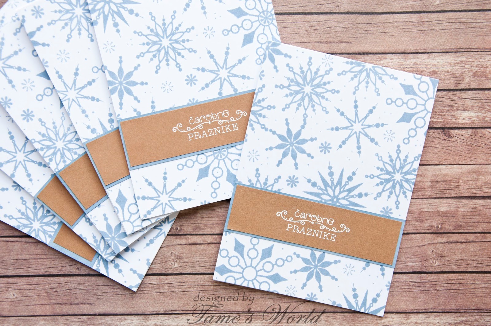 Enkrat sem dobila papir, ki je malce debelejši, rahlo deluje plastičen in sem testirala kako se obnese šablona na tem papirju. Rezultat mi je zelo všeč, šablona sicer tega papirje ne odpreže, zareže pa krasno v njega in naredi fantastično ozadje. Res pride svetovno, ravno malo popestri ozadje in tako je nastalo 6 preprostih voščilnic. Šablona je skoraj enako velika kot moje kvadratne osnove za voščilnice zato sem izrez na vsaki strani za milimeter skrajšala, da sem dobila malo rdečega roba. Ker nisem želela preveč zakriti ozadja sem dodala le napis. Napise sem odtisnila z